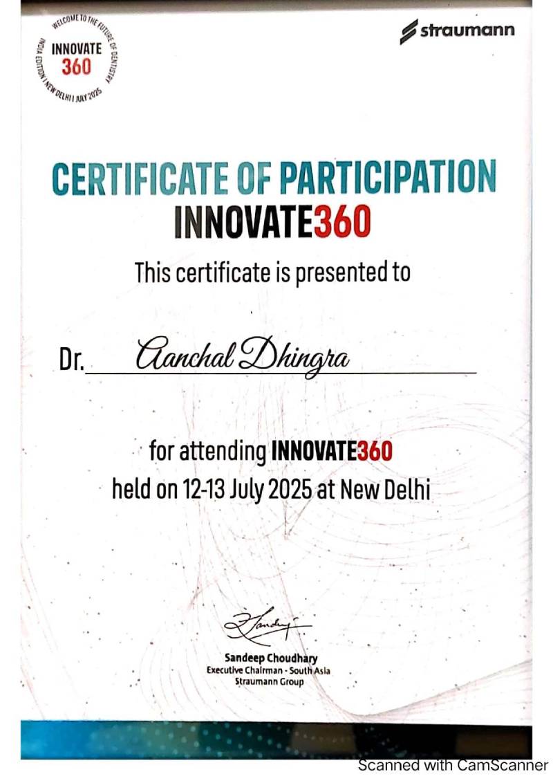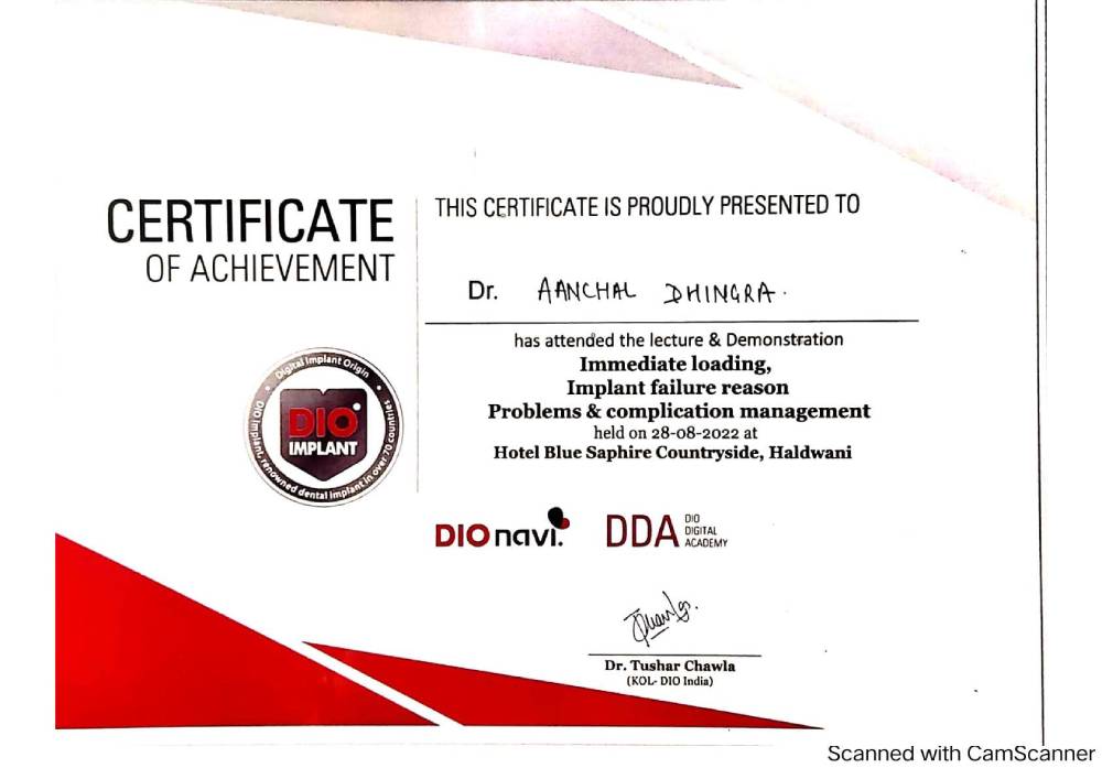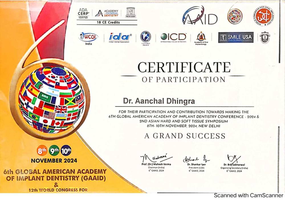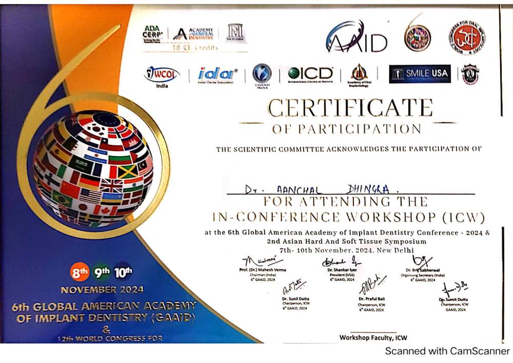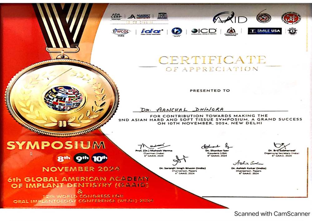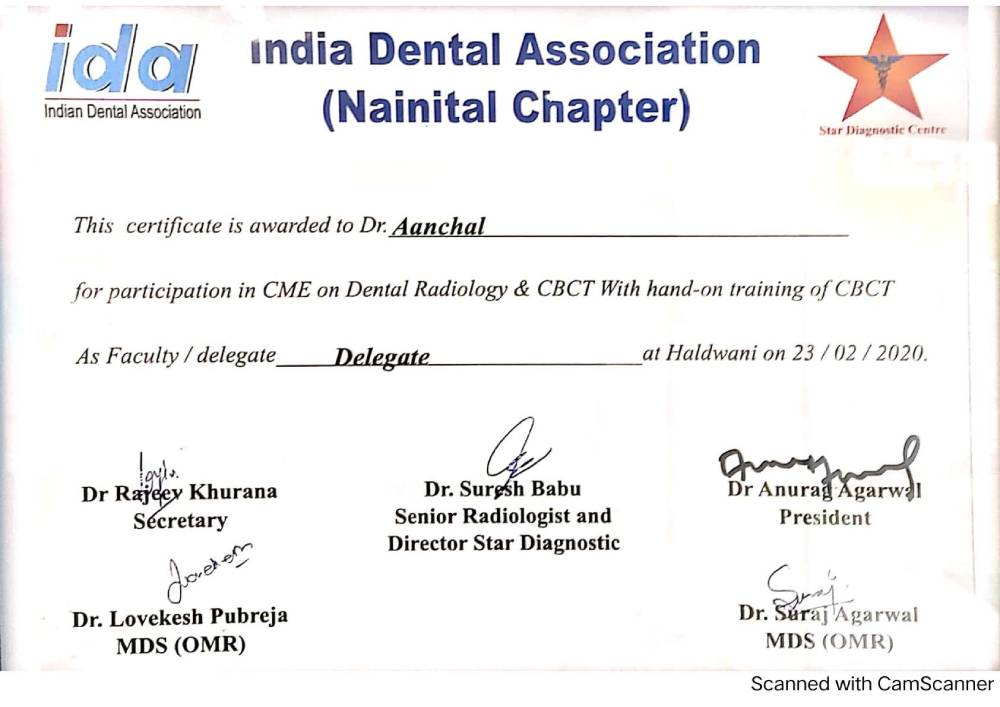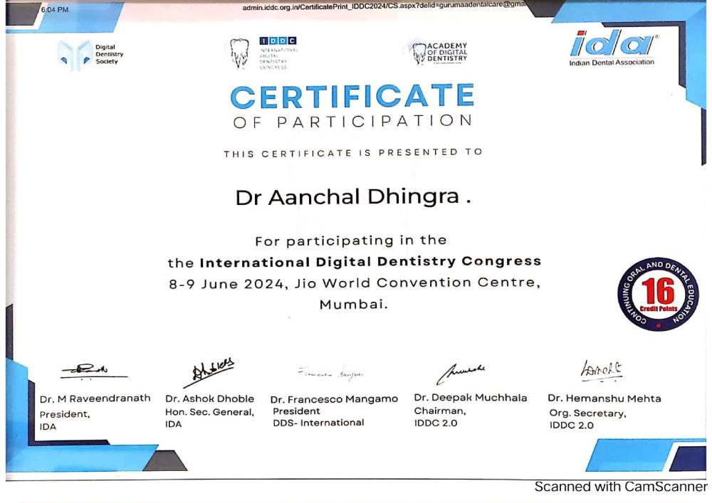 Dr. Aanchal Dhingra is MDS Endodontics and received her gold medal in 2021 by deputy chief minister of uttar Pradesh Dr. Dinesh Sharma as she topped the university. She is a Root Canal Specialist and Implantlogist. She is trained in smile designing, cosmetic dentistry, implant placement, laser in dentistry and Invisible aligner. She completed her CAD CAM training in Germany and received multitude awards in National and International conference She is awarded by CM of Uttarakhand Mr. Pushkar Singh Dhami Ji and Health Minister of UK Dr. Dhan Singh Rawat Ji in 2023 for Best Advanced Dental Hospital in Uttarakhand. She carried digital dentistry to Rudrapur as in all big cities and Guru Maa Advanced Dental Care has got the 1st entire set up of Digital Dentistry in uttarakhand.
